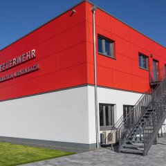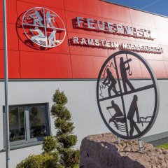 Die leuchtend rote Farbe fällt sofort ins Auge. Dann liest man den Schriftzug „Feuerwehr Ramstein-Miesenbach“ mit dem bekannten Feuerwehr-Signet, das die Tätigkeitsfelder der Feuerwehrleute darstellt: Retten – Löschen – Bergen - Schützen. Spätestens jetzt erkennt jeder, dass hier in der Straße Auf der Pirsch in Ramstein die Freiwillige Feuerwehr der Verbandsgemeinde Ramstein-Miesenbach zuhause ist.