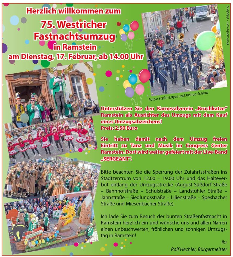 Wie Zugleiter Markus Kuproth gemeinsam mit Bürgermeister Ralf Hechler und dem Stadtbeigeordneten Joachim Felka informierte, sind für den „größten Umzug der Westpfalz“ bisher 96 Zugnummern gemeldet. Somit bewegt sich der Umzug in der Größenordnung der Vorjahre. Bei trockenem Wetter, worauf alle hoffen, erwarten die Veranstalter zwischen 10.000 und 14.000 Besucher. Zugesagt haben unter anderem 13 Karnevalsvereine aus der Region, die mit Prinzessinnen, Senatoren, Garden und Komiteewagen nach Ramstein kommen. Die USAFE-Band wird den Zug anführen, der um 14 Uhr in der August-Süßdorf-Straße Aufstellung nimmt und in die Bahnhofstraße startet. Zwei Guggemusik-Gruppen, die Kolpingkapelle Kindsbach und der Fanfarenzug Kusel werden ebenfalls musikalisch unterhalten. Aus der französischen Partnerstadt Maxéville wird wieder eine Fußgruppe am Umzug teilnehmen.