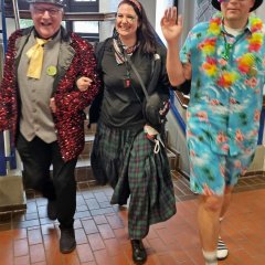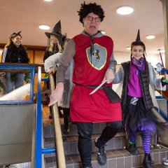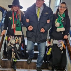 Übermächtig war die Hexenschar, die pünktlich um 11.11 Uhr das Rathaus in Ramstein erstürmte auf der Suche nach Männern. Mit Besen, Trillerpfeifen, viel Lärm und Geschrei durchforsteten die Hexen das Haus. Sobald sie einen Mann erblickten, half kein Jammern und Klagen. Unbarmherzig wurden die Krawatten als Zeichen der männlichen Macht und Würde abgeschnitten und die armen Kerle mussten trotz Regen in den Brunnen neben dem Rathauseingang, bewacht von grimmigen Hexenwächterinnen.