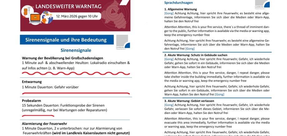 Am 12. März gegen 10.00 Uhr findet der landesweite Probewarntag statt, die Entwarnung erfolgt gegen 10.45 Uhr. Seit 2025 führt Rheinland-Pfalz auch einen landesweiten Warntag durch. Dieser findet seither am zweiten Donnerstag im März statt.