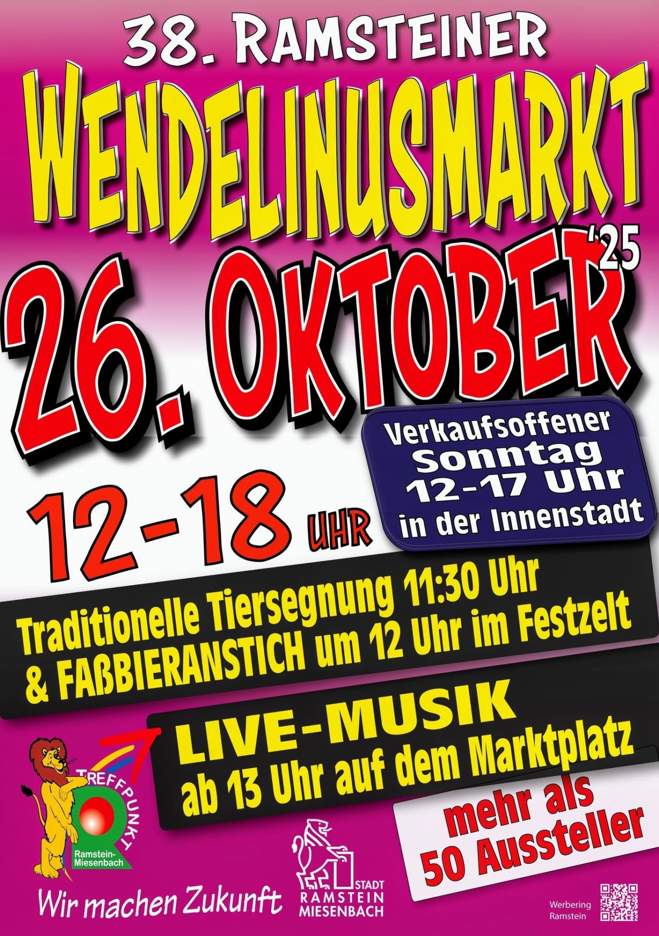 | So. 26.10. | 12-18 Uhr | Wendelinusmarkt in Ramstein mit verkaufsoffenem Sonntag und Tiersegnung um 11.30 Uhr im Festzelt |